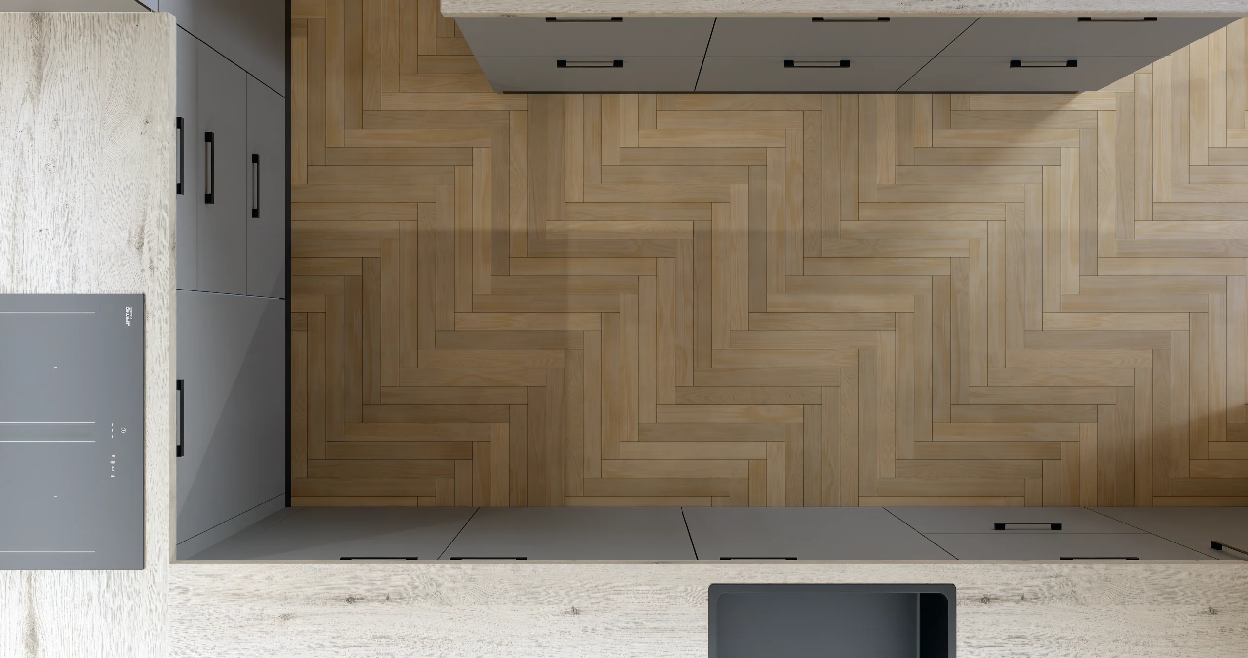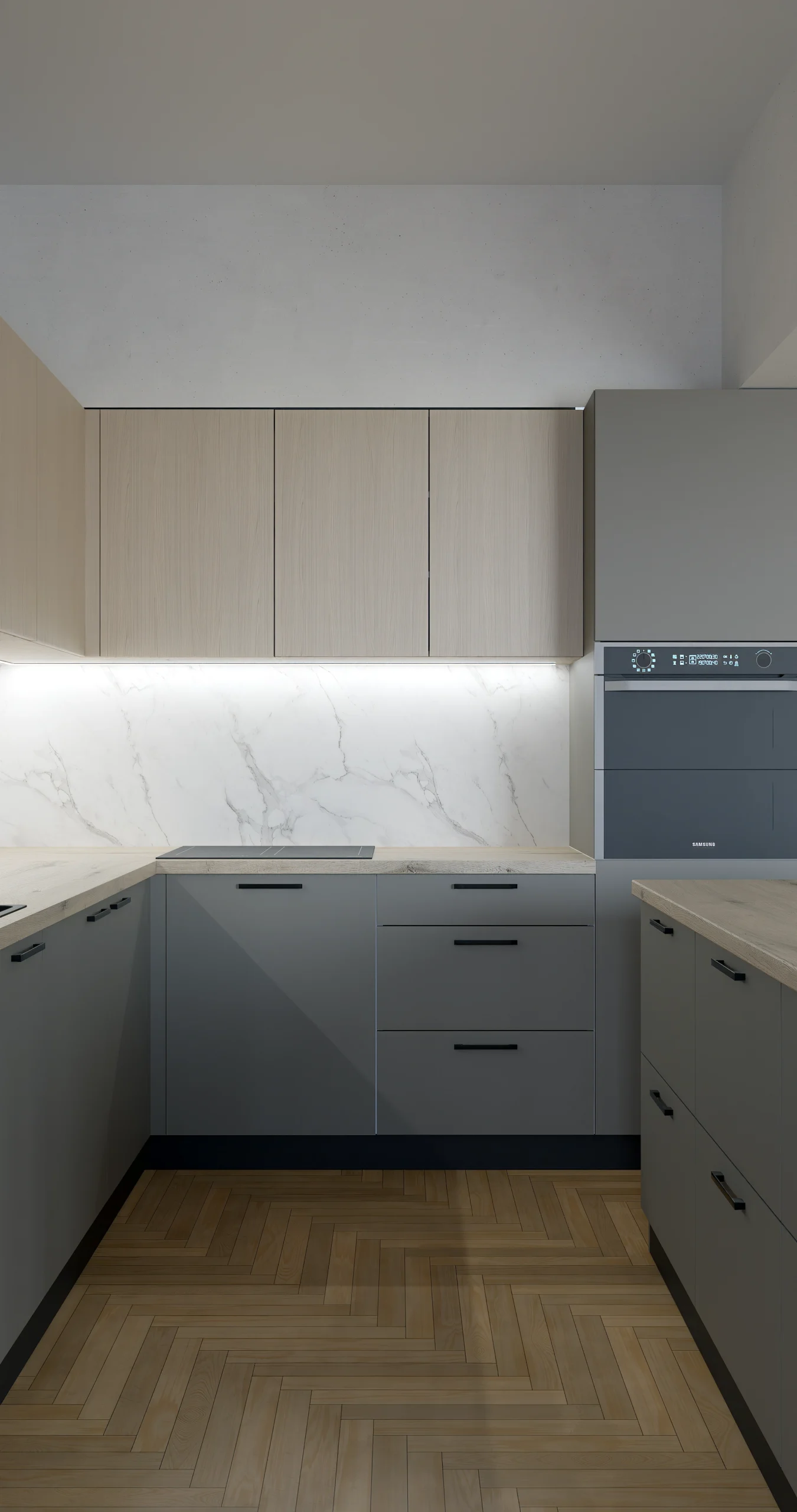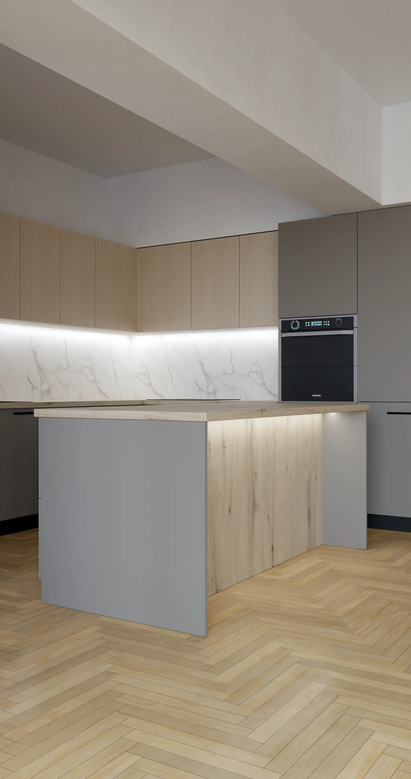 This elegant contemporary kitchen exemplifies refined minimalism through its sophisticated material palette and expertly layered lighting design. The space features a harmonious blend of warm beige handleless upper cabinets paired with charcoal gray lower cabinetry, creating subtle visual depth while maintaining a cohesive look. A stunning white marble backsplash with delicate gray veining serves as the focal point, beautifully illuminated by integrated LED strip lighting that enhances the stone’s natural beauty. The generous central island, clad in light wood grain finish, anchors the space and includes ambient under-counter lighting that adds warmth and dimension. Integrated appliances, including a built-in oven and microwave tower, maintain the streamlined aesthetic, while a sleek matte black faucet provides a modern accent against the marble backdrop. Natural oak herringbone flooring adds organic texture and warmth, complementing the room’s open-plan layout that flows seamlessly into adjacent living spaces. The recessed ceiling detail and crisp white walls complete this sophisticated design, creating a kitchen that balances luxury materials with approachable, livable style.