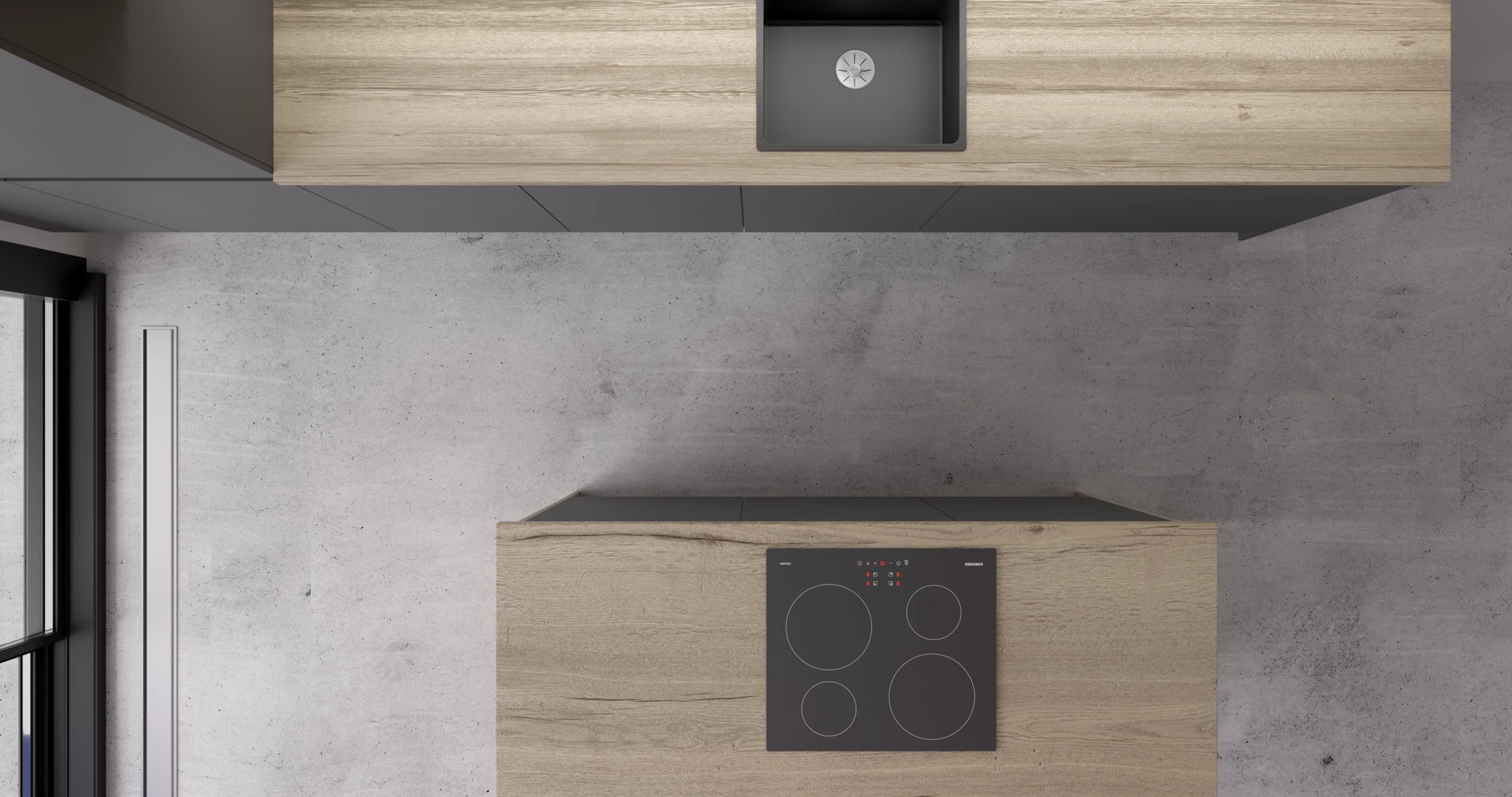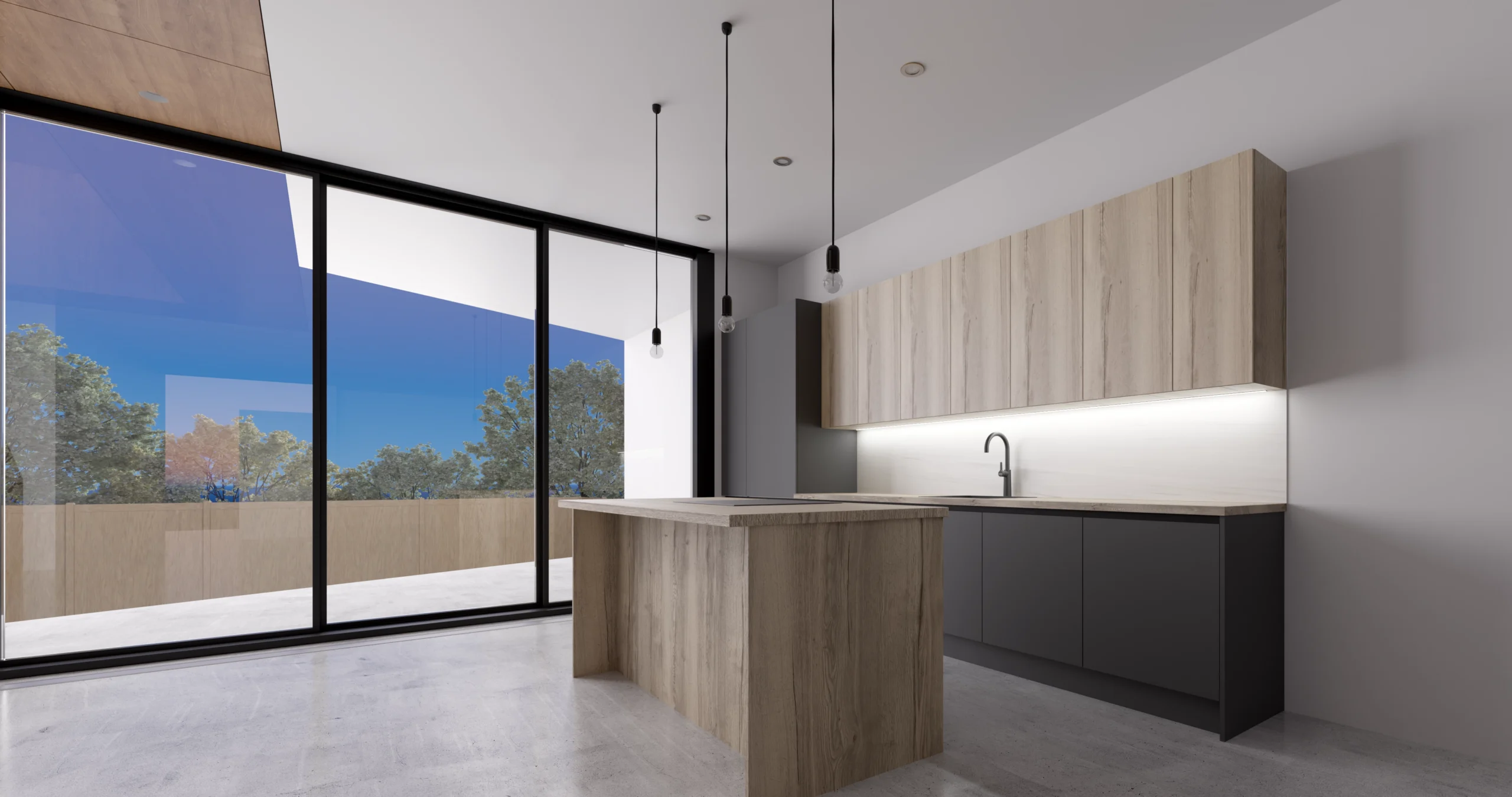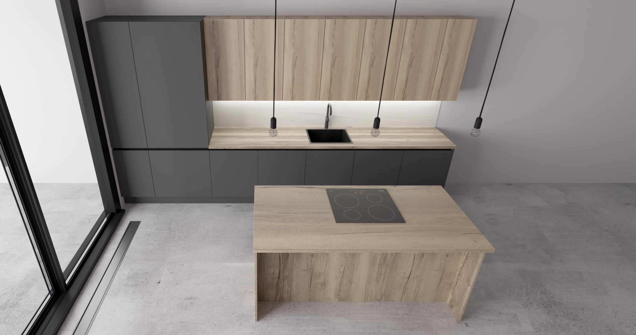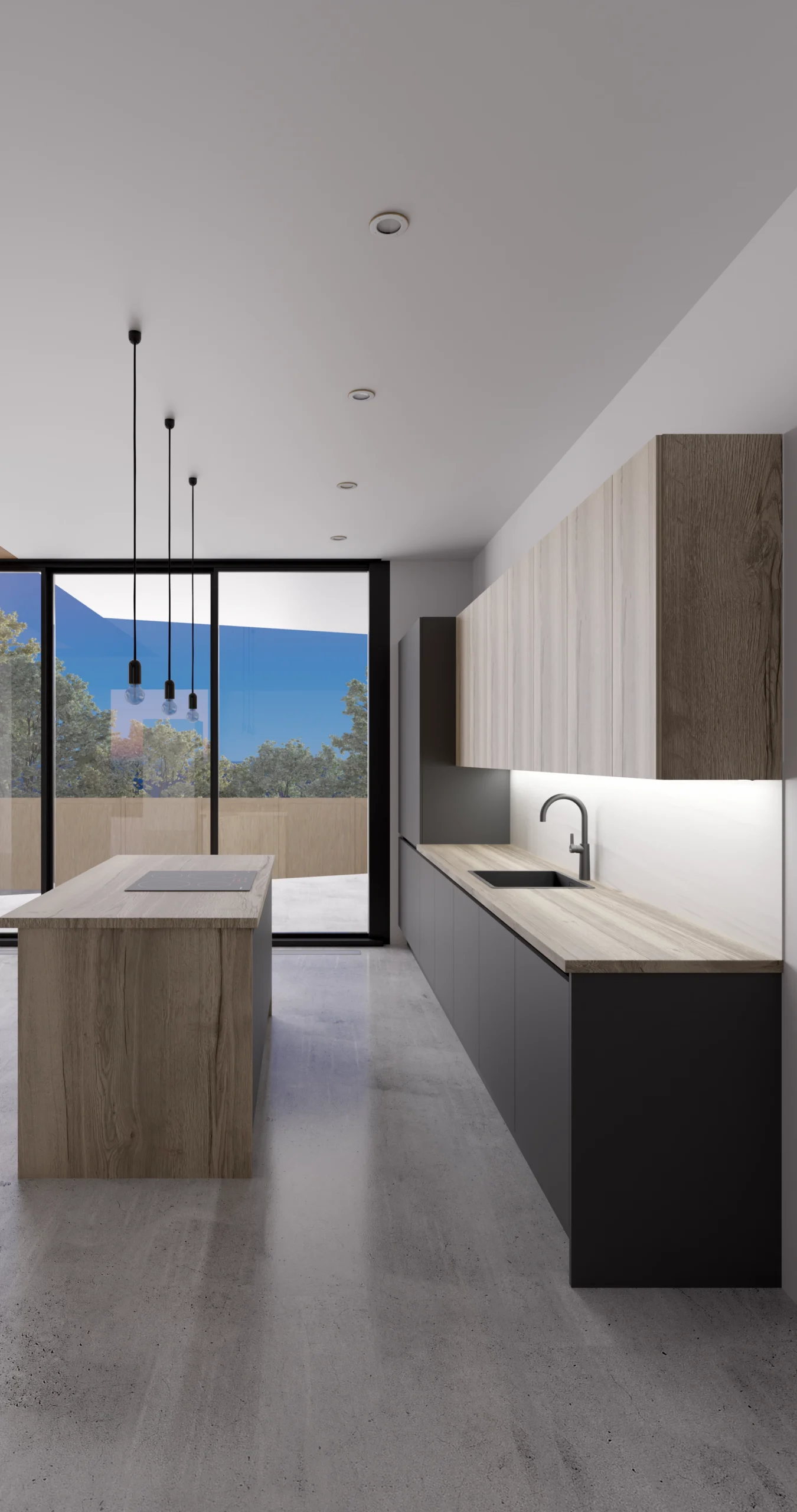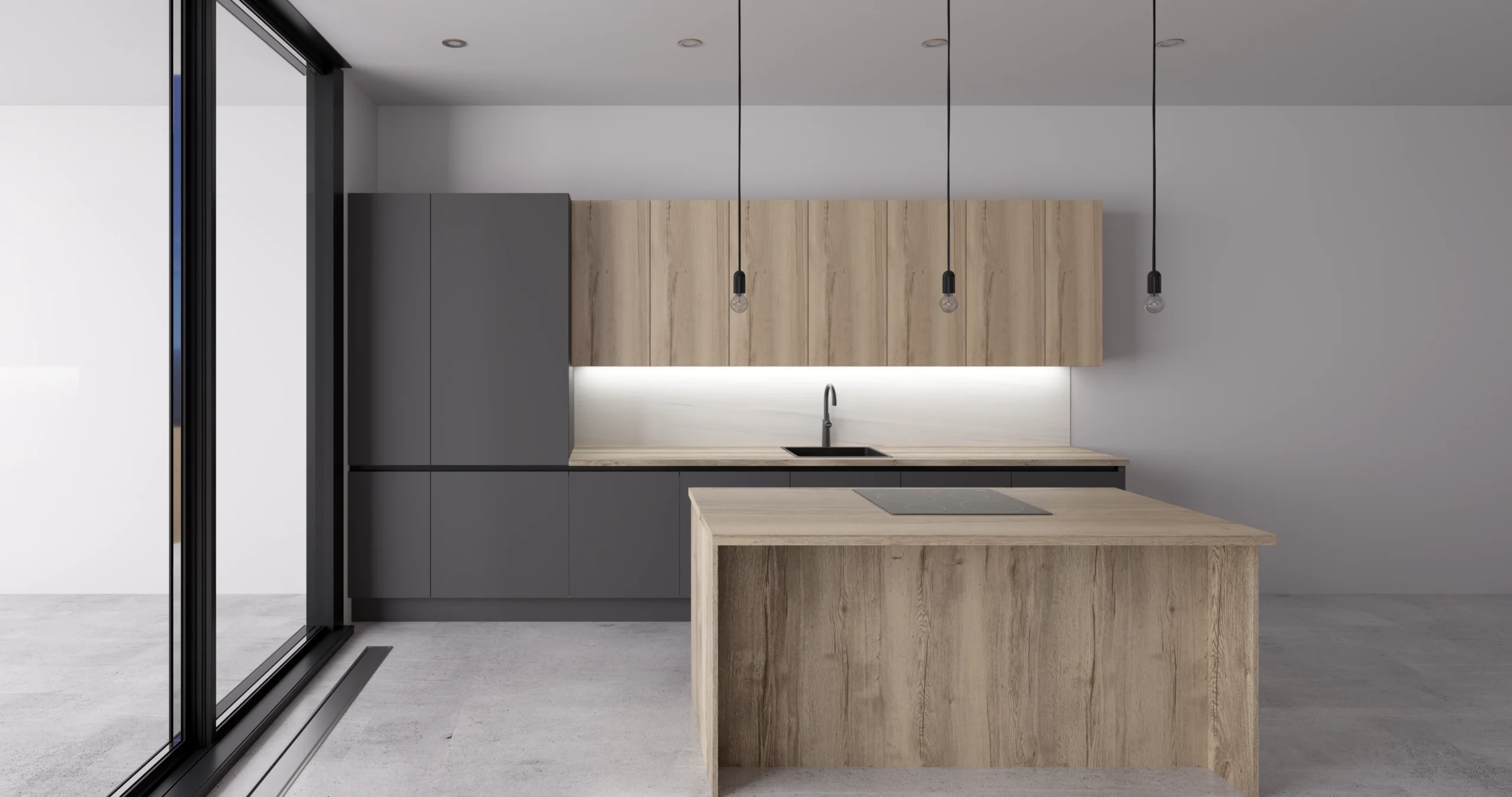 This modern minimalist kitchen showcases a sophisticated two-tone design that balances warmth and contemporary style. The space features sleek dark gray handleless lower cabinets contrasted beautifully with light wood grain upper cabinets and countertops, creating visual interest while maintaining a clean aesthetic. The linear layout includes a practical peninsula island with an integrated black induction cooktop, perfect for both cooking and casual dining. Thoughtful lighting enhances the space through under-cabinet LED strips and distinctive black pendant fixtures above the sink area. The kitchen is anchored by polished concrete-look flooring and bathed in natural light from floor-to-ceiling black-framed glass doors, embodying Scandinavian-inspired design principles of functionality, simplicity, and organic materials. The handleless cabinetry and streamlined silhouette create an uncluttered, sophisticated atmosphere ideal for modern living.