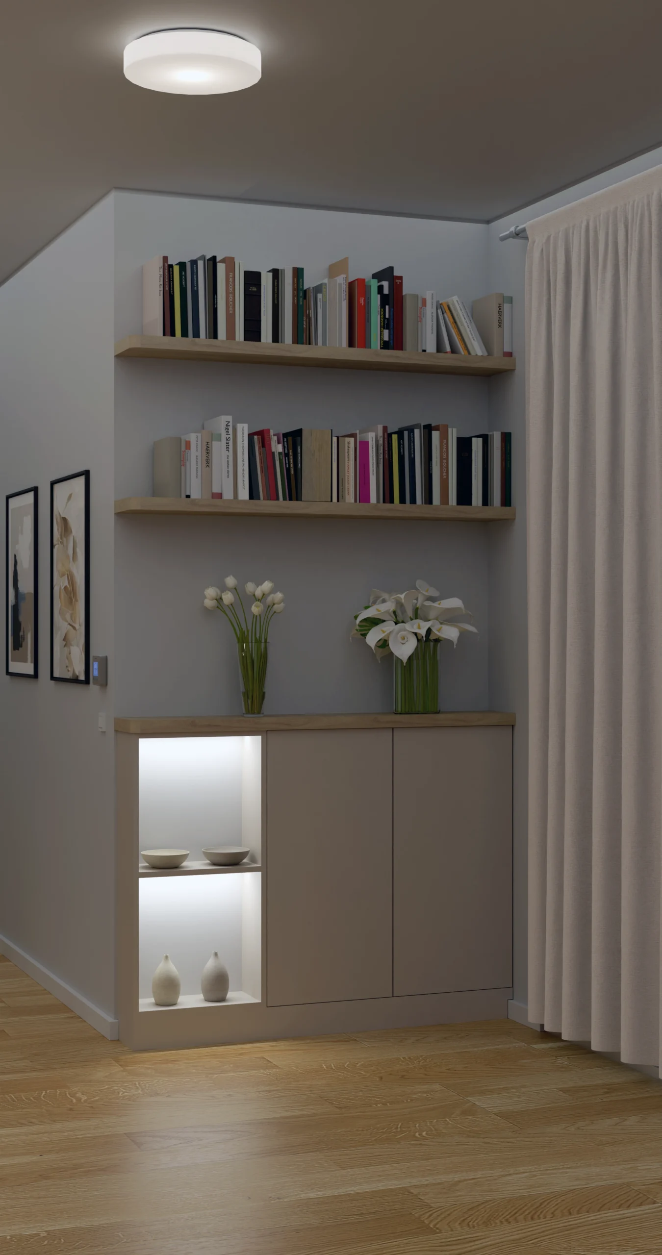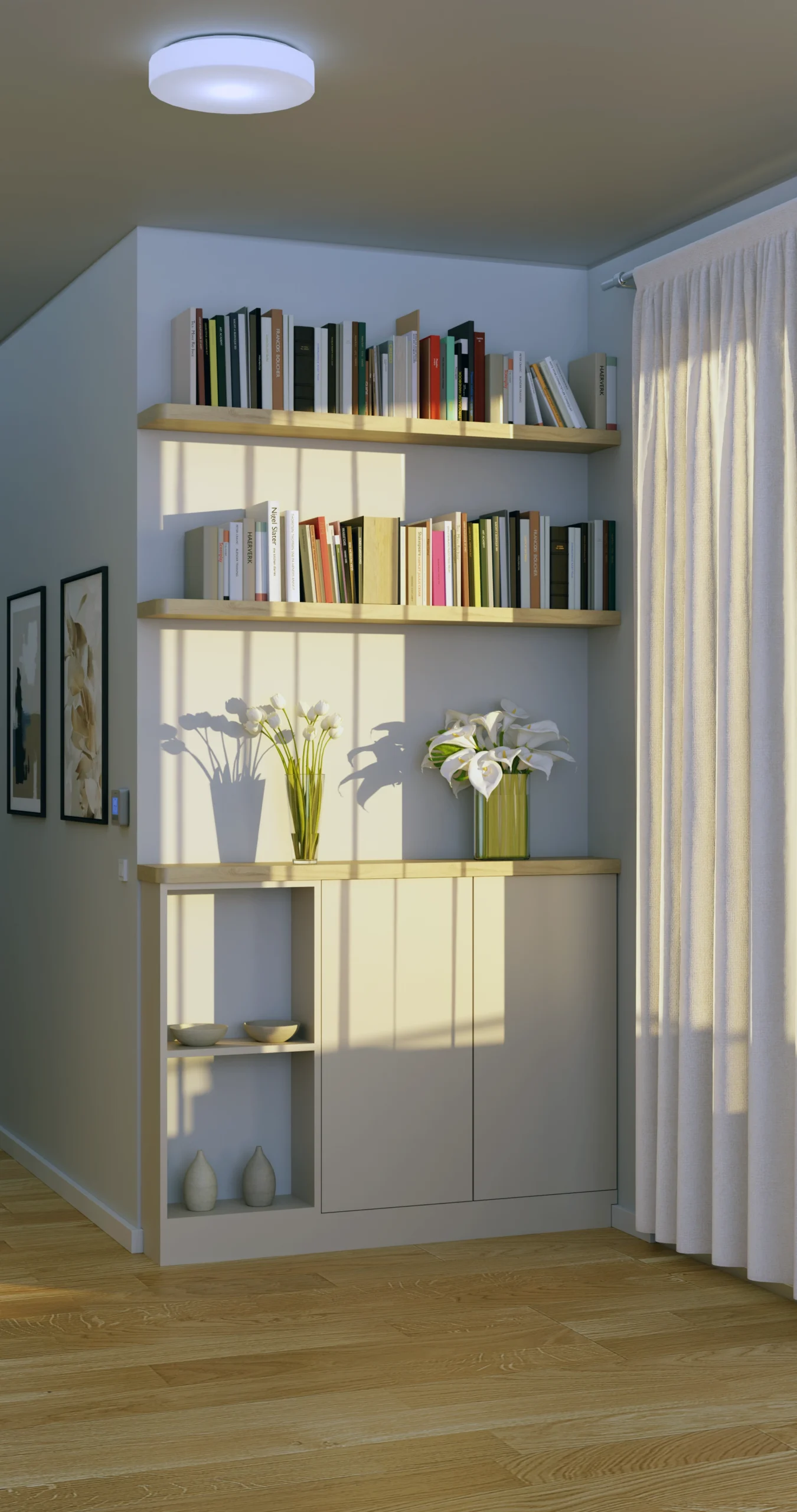 Conceived entirely in software and rendered with photorealistic precision, this floor-anchored wall unit demonstrates what becomes possible when design tools match the ambition of the designer.